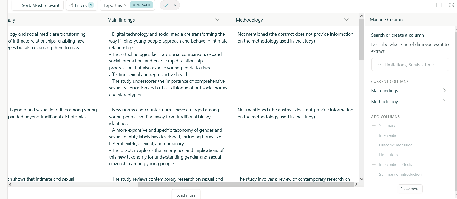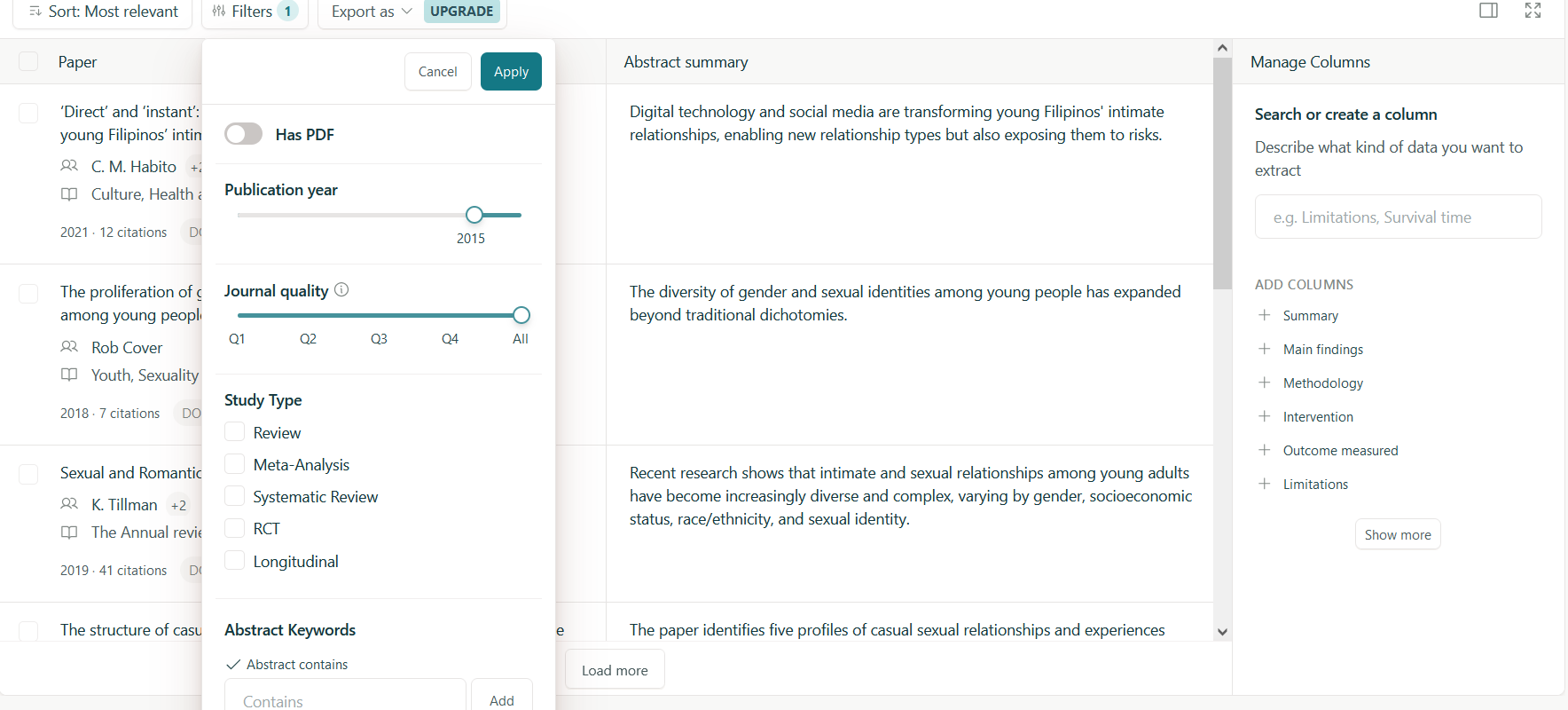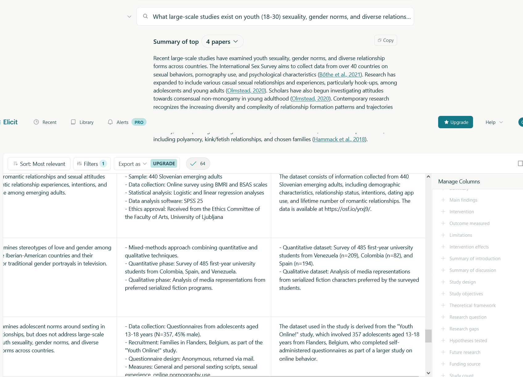 Elicit est utile pour une phase exploratoire, afin d’identifier rapidement des travaux existants sur les sexualités, les normes de genre et les pratiques relationnelles chez les jeunes. Il permet de repérer des tendances, d’accéder à des synthèses structurées, et de comparer des études issues de différents contextes.