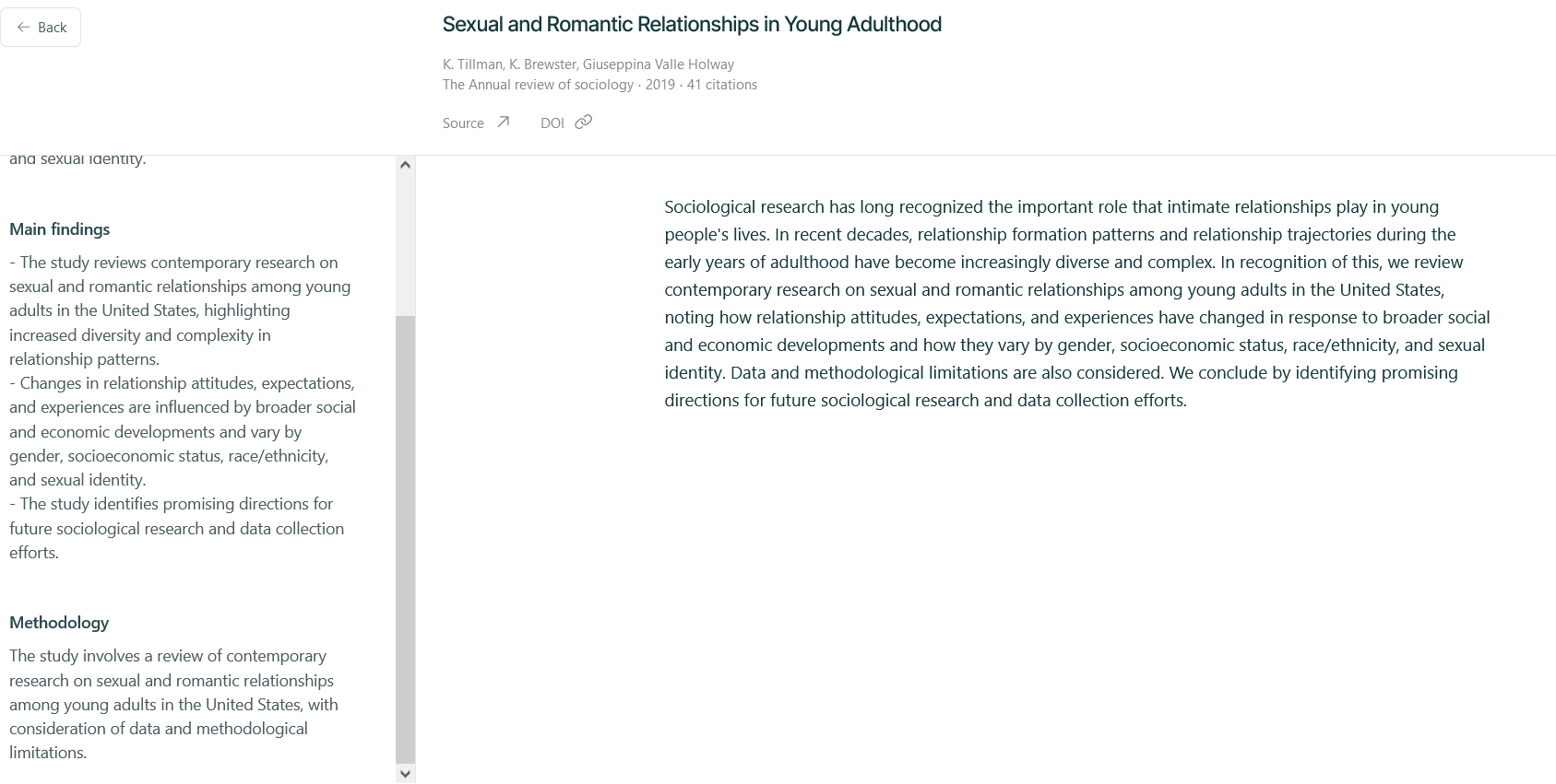 - Recherche peu efficace pour des sujets sociologiques ou critiques : la recherche fonctionne principalement par mots-clés simples (pas par questions), ce qui rend difficile l’exploration de notions complexes comme la diversité des relations, les représentations du genre ou les normes sociales chez les jeunes adultes.