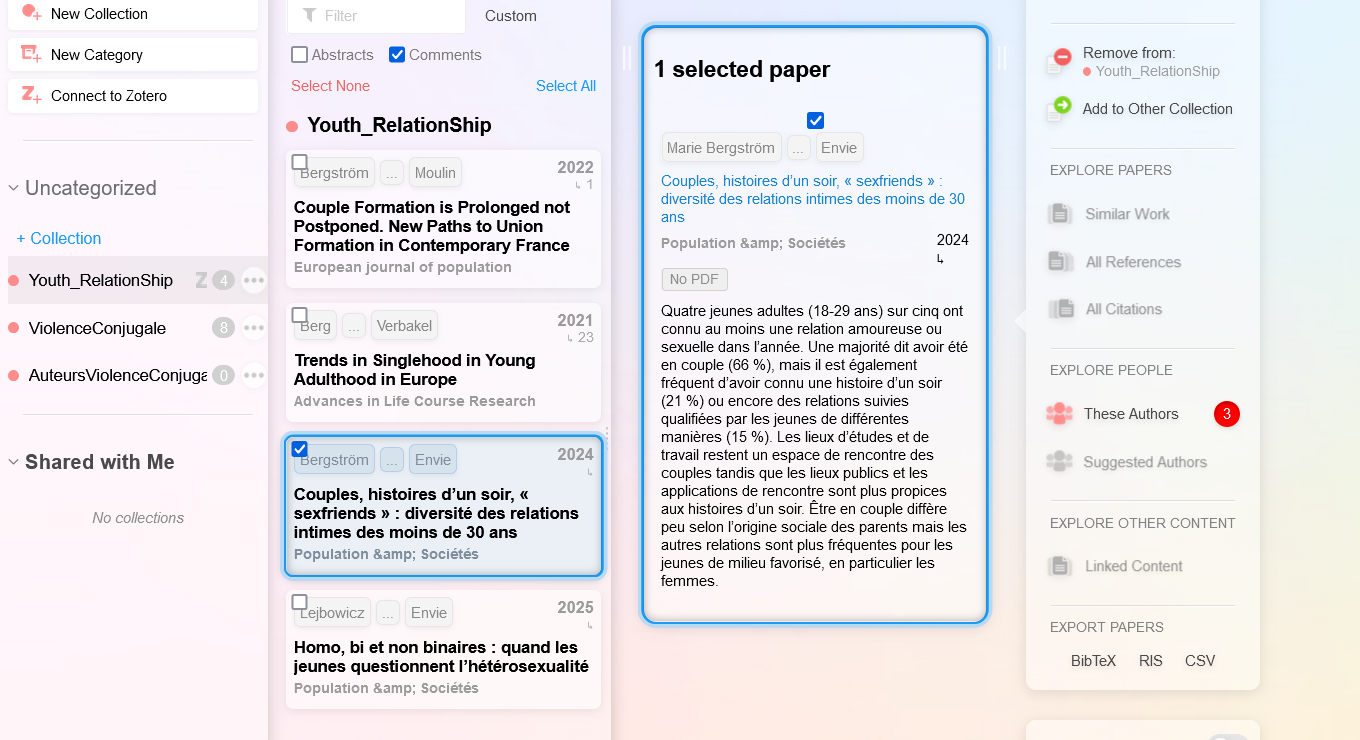 - Import de l’article : Bergström, M., Maillochon, F., and Envie, (2024). “Couples, one-night stands, sexfriends: The varied intimate lives of the under-30s”. Population & Societies, No 623(6), 1-4. → exploration des travaux connexes. Puis comme ne suffit pas (car très mauvaise indexation des articles en français), import d’autres articles anglophones proches du thème.